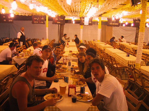 Getting Ripped off eating Paella - the two at the front of the pic paid €16 each, the next 6 paid €12 and the last 2 paid €9 - all for the same meal, more or less based on how much spanish you knew... |